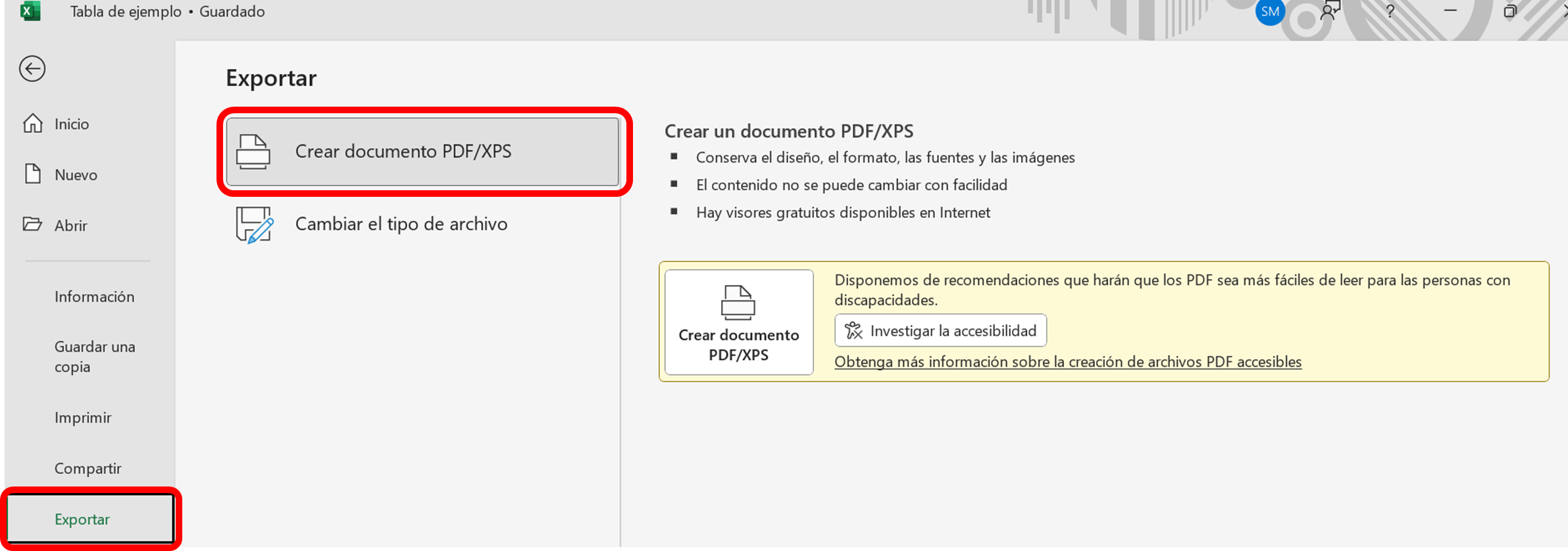 Una alternativa más rápida es ir a Archivo> Exportar > Crear documento PDF/XPS.