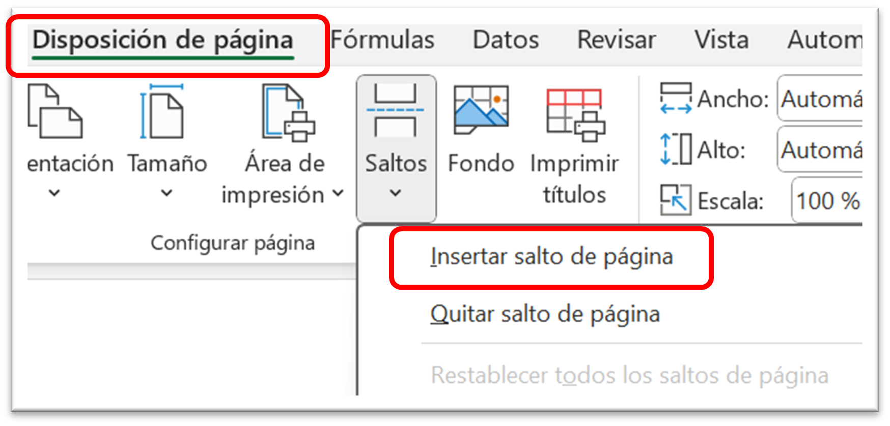 Si se requiere que una parte de la hoja se imprima en una página nueva, se puede insertar un salto de página: