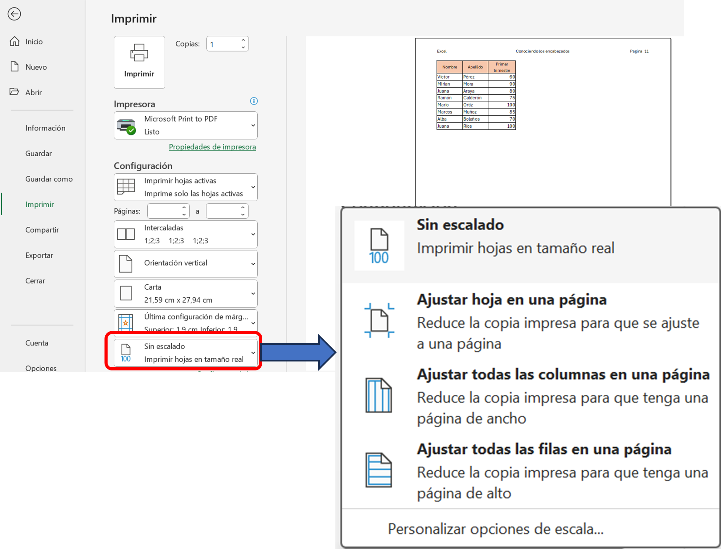 - Ajustar todas las filas en una página: Ajusta la altura de las filas para que quepan en una sola página.