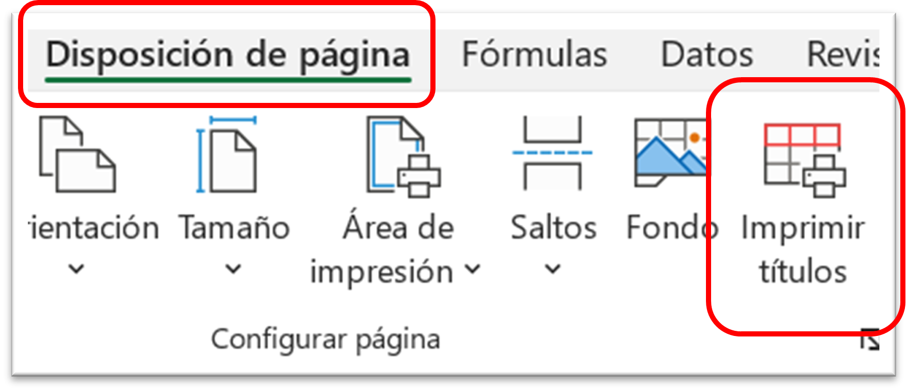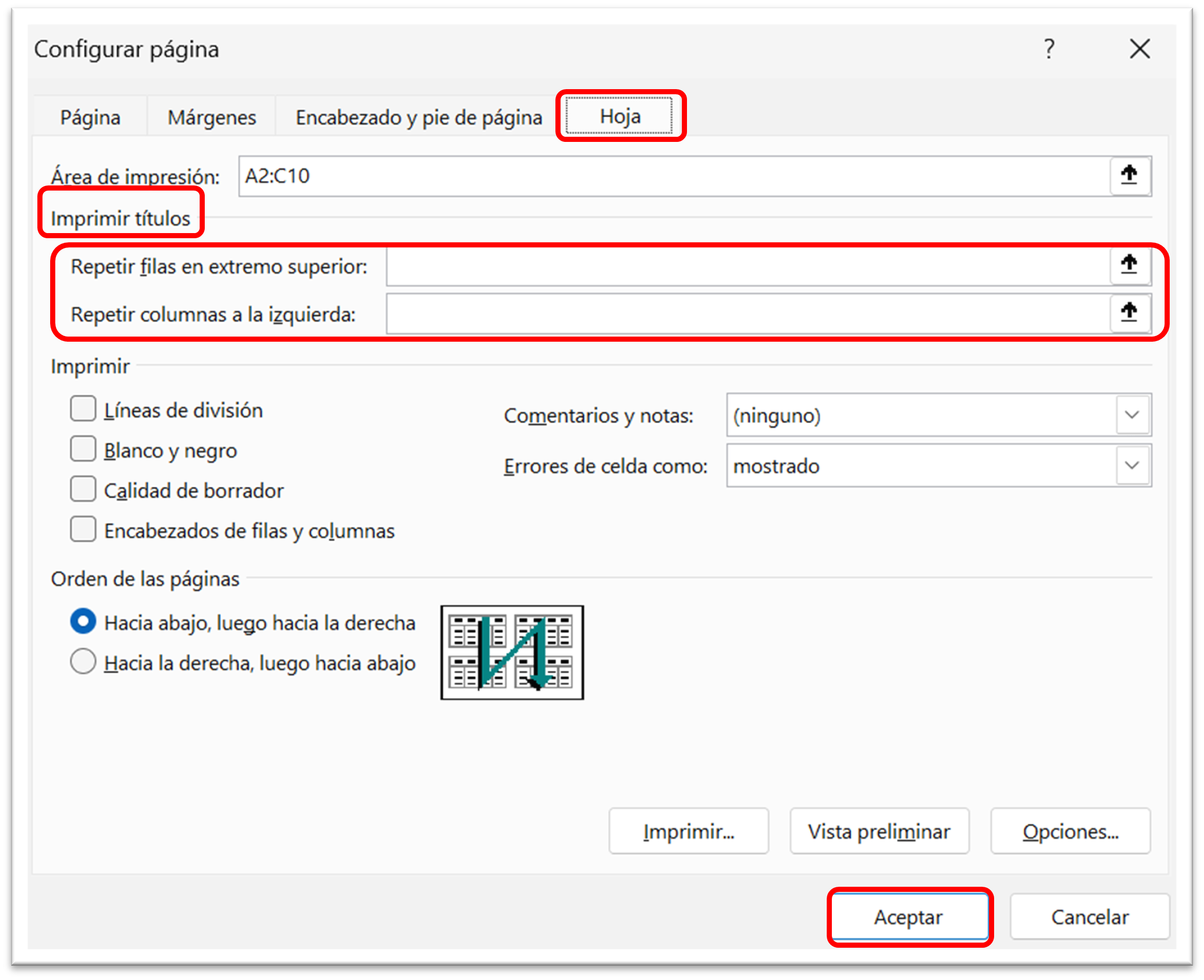 3. En la pestaña Hoja, en la sección Imprimir títulos, se encuentran dos opciones: