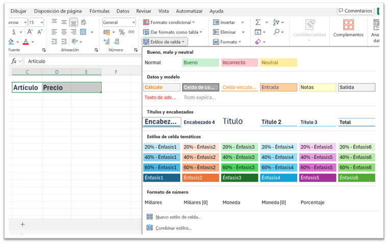 - 2. En la pestaña Inicio, busque el grupo Estilos y haga clic en Estilos de celda.