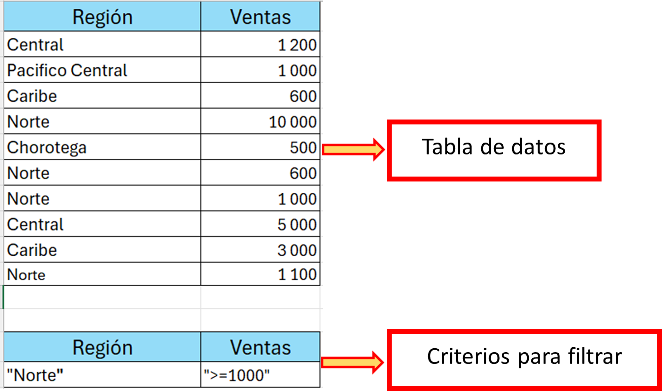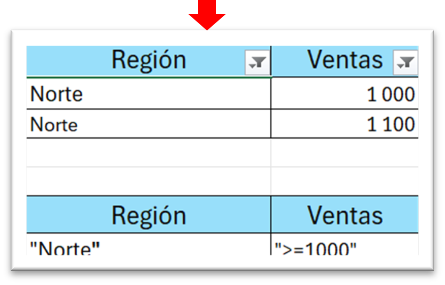- 2. Ejemplo: Debajo de cada encabezado, escriba los criterios que quiere aplicar. Por ejemplo, si quiere filtrar por "Región" que sea "Norte" y "Ventas" que sean ">=1000", escriba "Norte" debajo de "Región" y ">=1000" debajo de "Ventas".