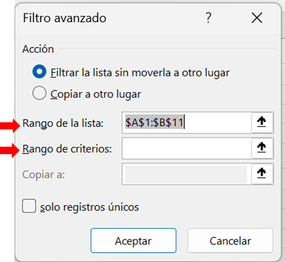 - Acción: Elija "Filtrar la lista sin moverla a otro lugar" si se quiere filtrar los datos en la misma tabla, o "Copiar a otro lugar" si quiere que el resultado del filtro se muestre en otra parte de la hoja de cálculo.