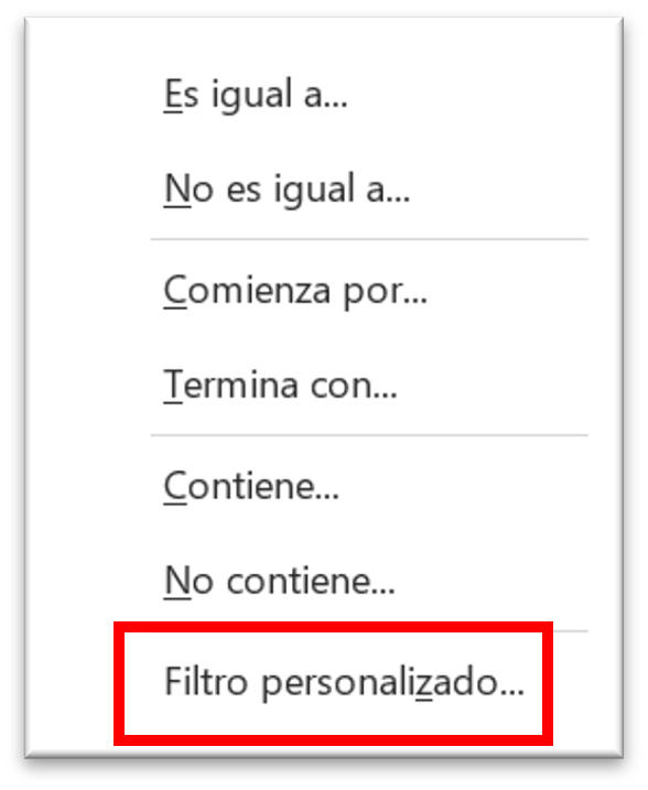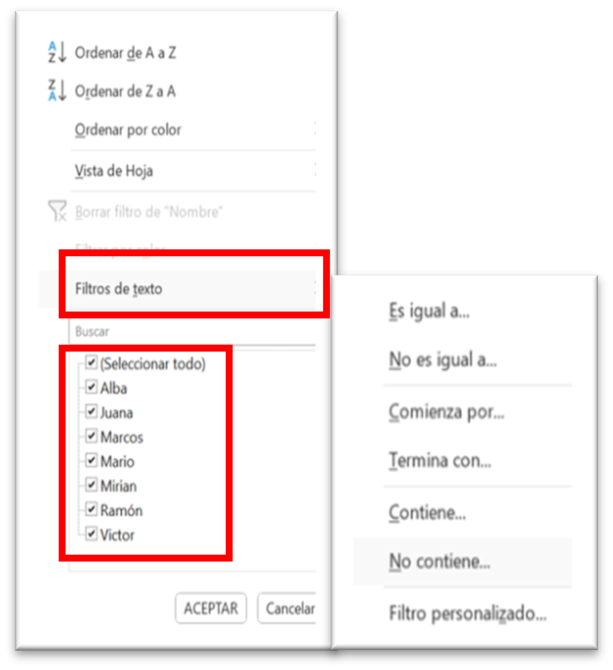 - Filtro por texto: Puede desmarcar las casillas para ocultar ciertos valores, o usar la opción "Filtros de texto" para criterios más avanzados como "Contiene", "Empieza por", etc.