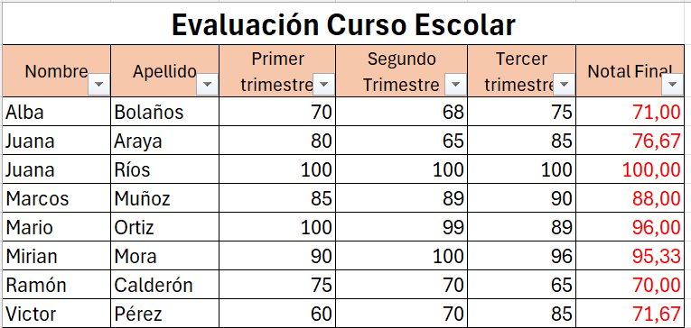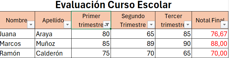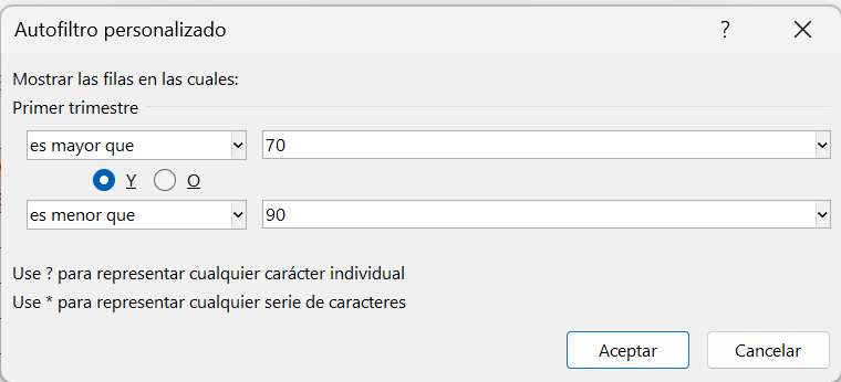 - 7. Si selecciona filtro personalizado, se debe escribir los criterios del filtro, por ejemplo, en la siguiente tabla se necesitan las notas mayores a 70 y menores de 90 del primer trimestre (este es un filtro personalizado).
