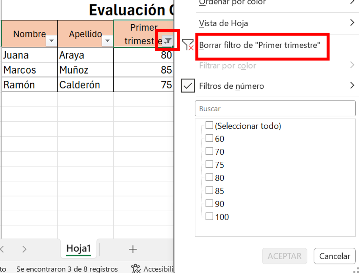 - 9. Haga clic en Aceptar para aplicarlos. Los datos que no cumplen con el filtro quedarán ocultos.