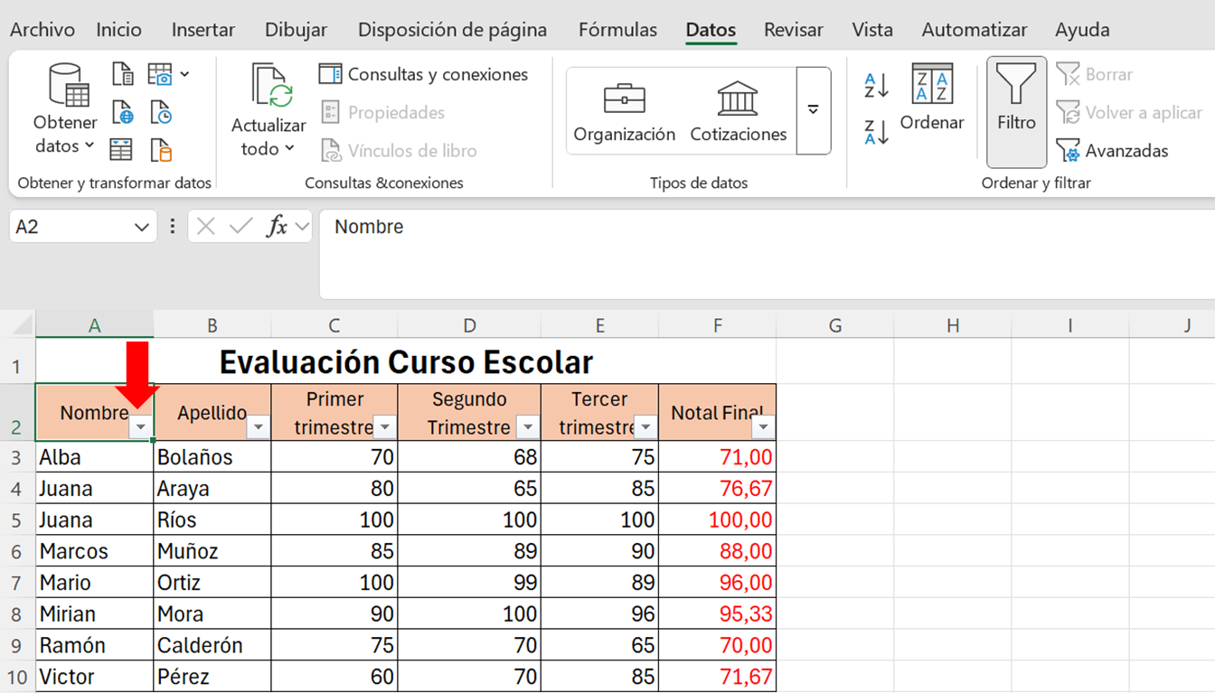 - 5. Observe que en los encabezados de cada columna aparecen unas flechas desplegables.