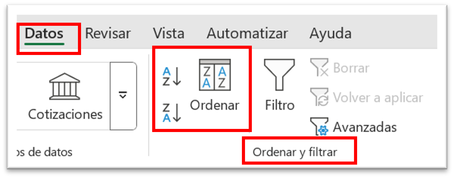 - 4. En el grupo "Ordenar y filtrar", haga clic en el botón Ordenar.