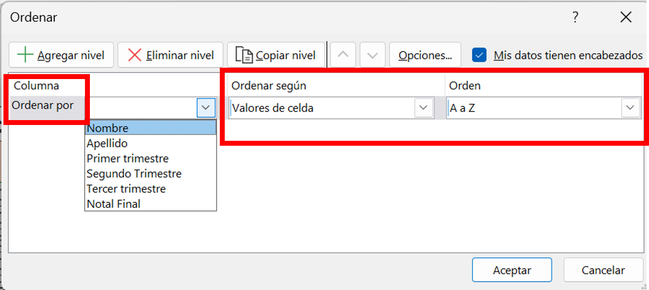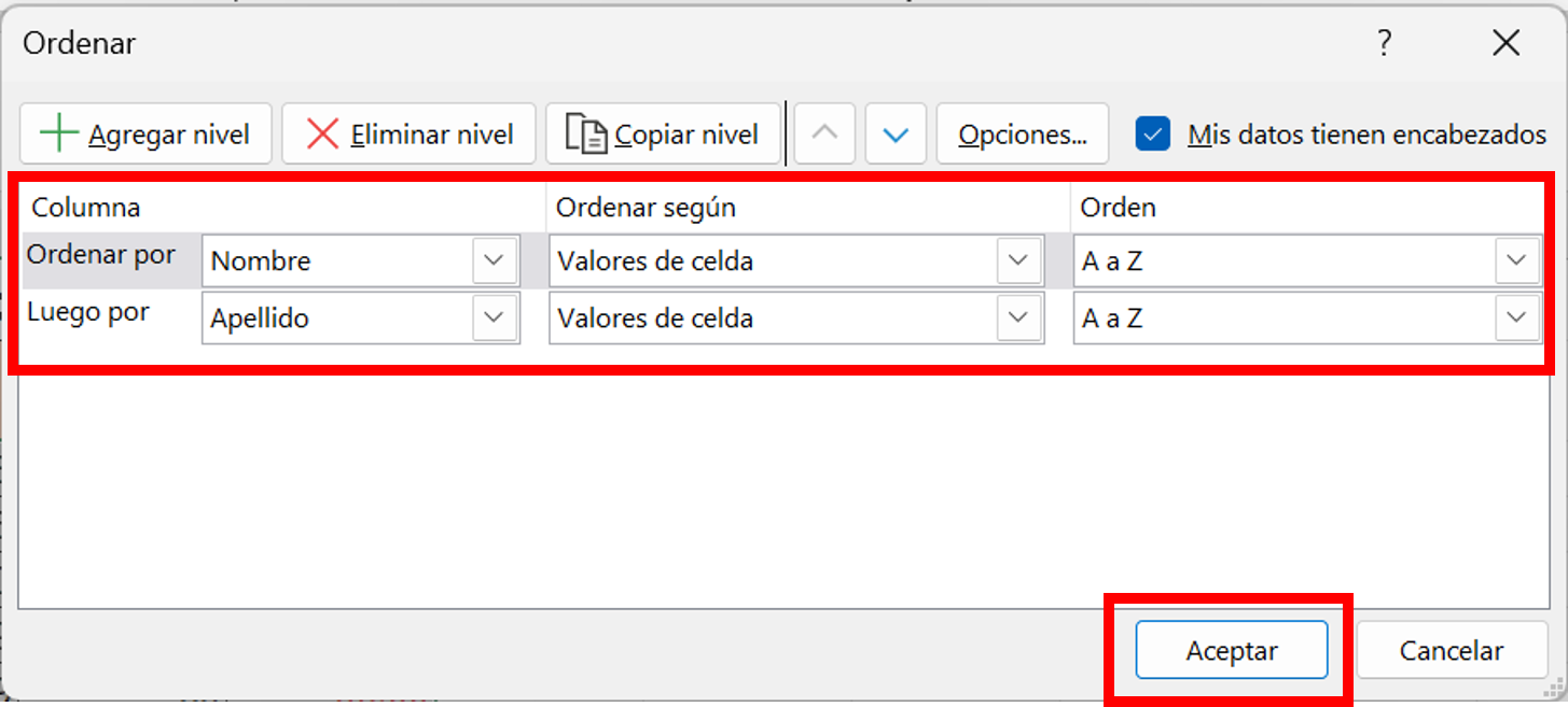 - 9. Añadir más niveles de ordenación (opcional): Si se necesita ordenar por varias columnas (por ejemplo, ordenar por "Nombre" y luego por "Apellidos"), haga clic en el botón Agregar nivel. Repita los pasos 4 y 5 para la segunda columna.
