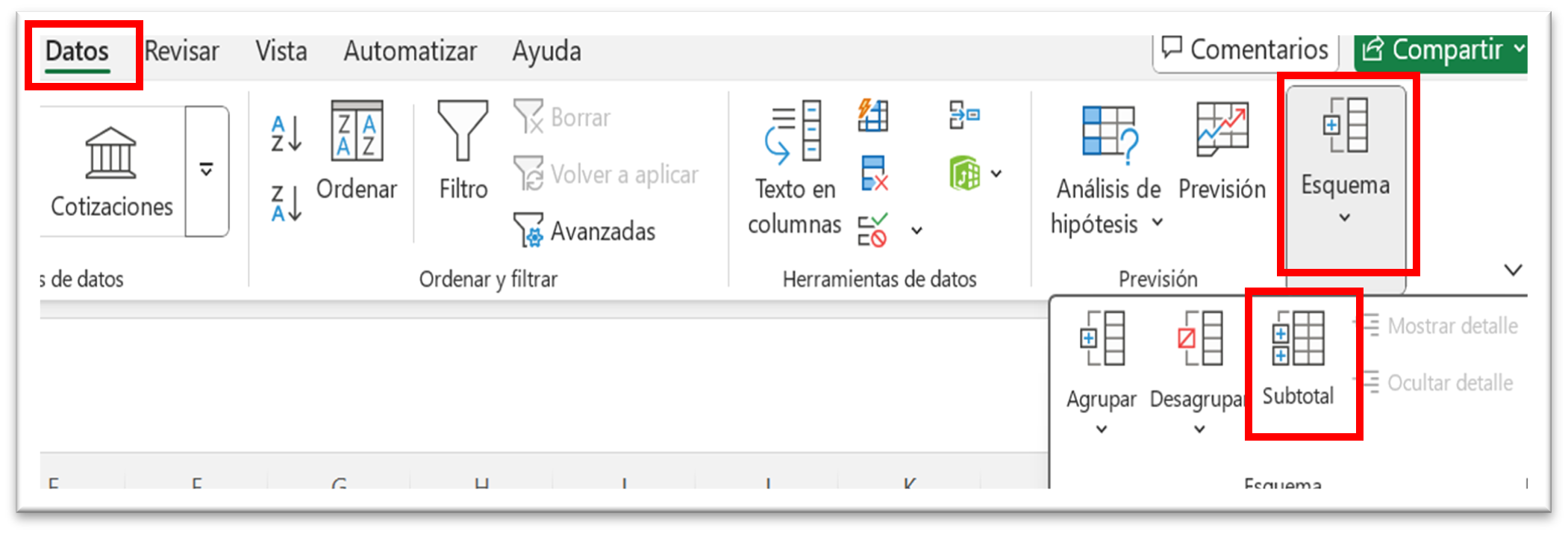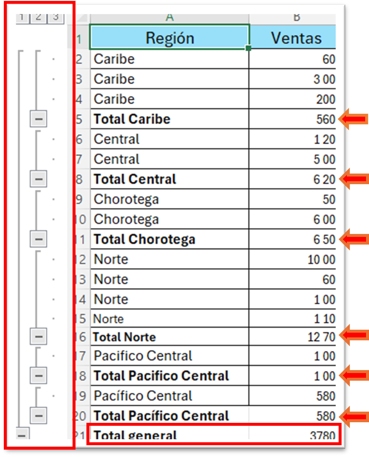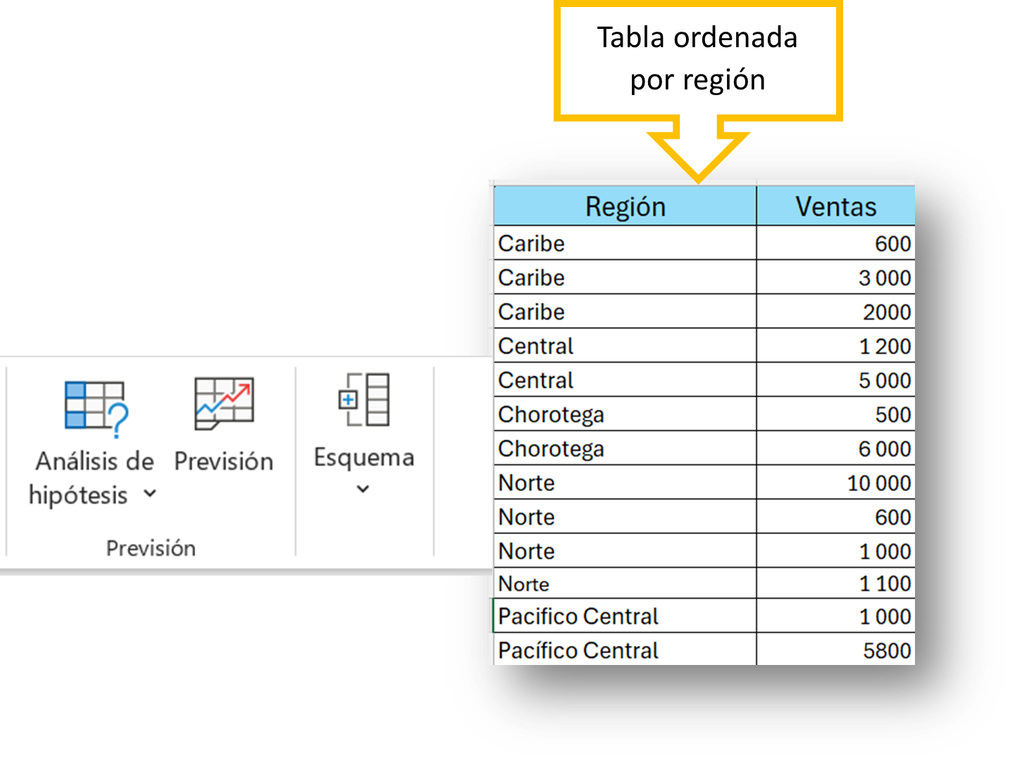 - 1. Primeramente, se debe ordenar la tabla por la columna que se requiera usar para agrupar los subtotales. Por ejemplo, si se quiere subtotales de ventas por región, primero se debe ordenar la tabla por la columna "Región".