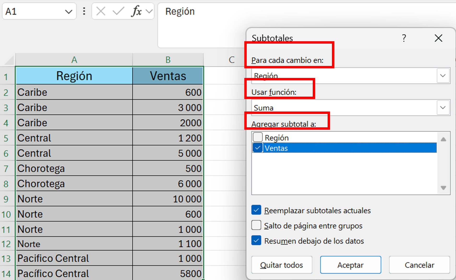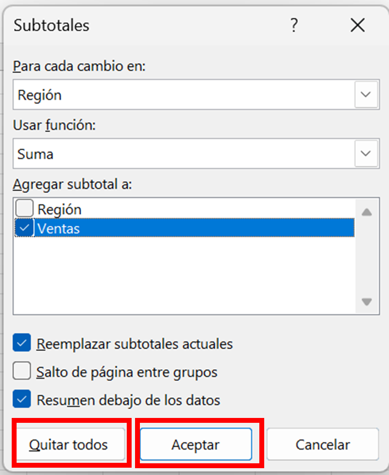 - Agregar subtotal a: Marque la casilla de la columna donde quiere que se aplique la función (por ejemplo, "Ventas").