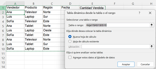 - 7. Confirma el rango de datos y la ubicación: Excel detectará automáticamente el rango de sus datos. Elija si quiere que la tabla dinámica se cree en una "Nueva hoja de cálculo" (recomendado) o en la "Hoja de cálculo existente".