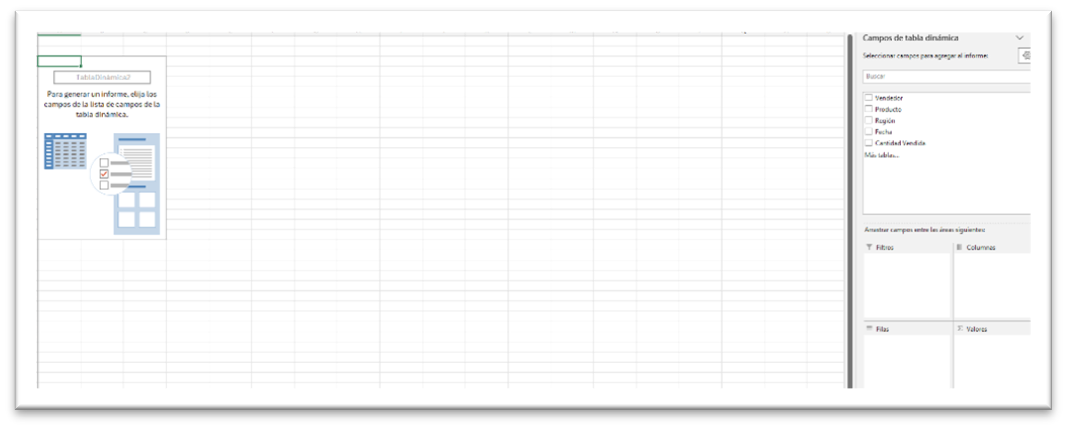 - 8. Haga clic en "Aceptar": Se creará una hoja nueva con un área en blanco para la tabla dinámica y un panel llamado Lista de campos de tabla dinámica.