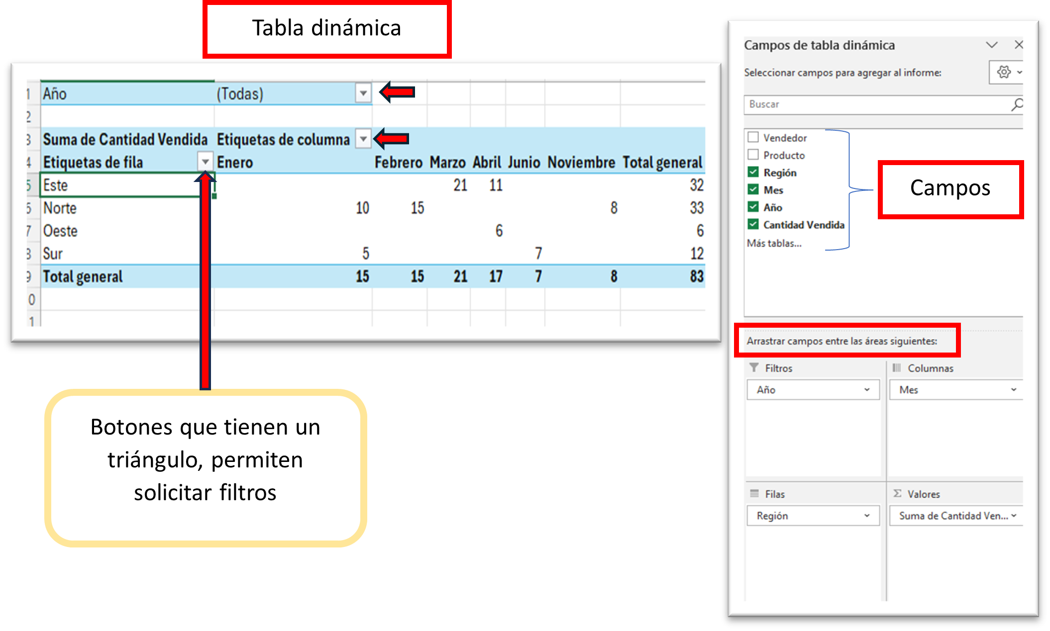 - 9. Arrastre los campos: En la "Lista de campos", arrastre los nombres de las columnas a las áreas de abajo:
