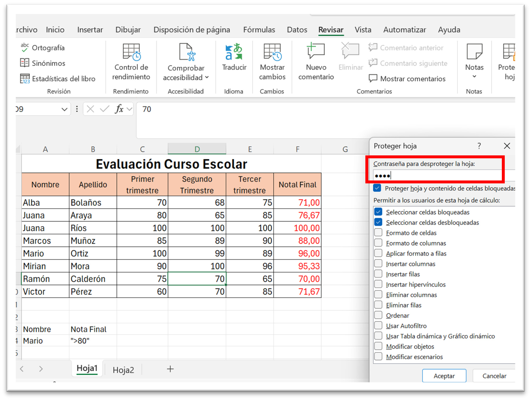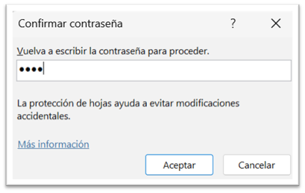 Con esto, toda la hoja de cálculo estará protegida, y solo se podrá editar si se desprotege la hoja con la contraseña.