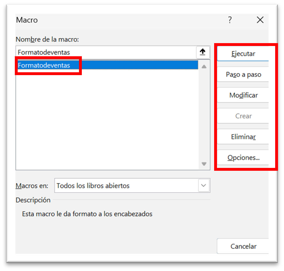 Para ver las macros que se han creado. 1. Vaya a la pestaña Programador. 2. Haga clic en el Botón Macros. 3. Le aparecerá una ventana, donde se muestran las macros que existen y opciones al lado derecho para ejecutar la macro, modificarla, eliminarla etc.