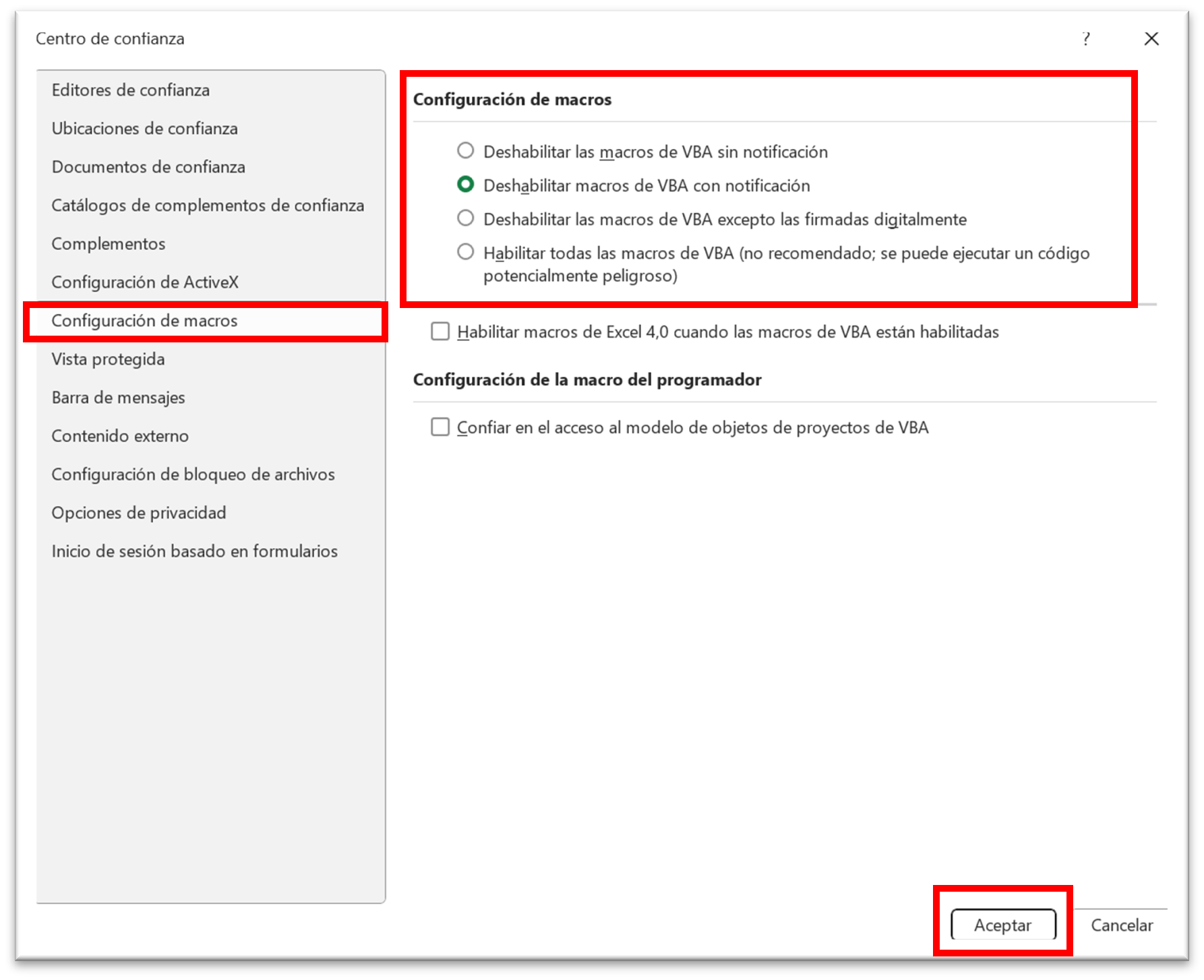 - - Deshabilitar todas las macros con notificación: Esta es la opción recomendada. Cuando se abre un archivo con macros, Excel le avisa con una barra amarilla de advertencia y le da la opción de habilitarlas si confía en el origen del archivo.