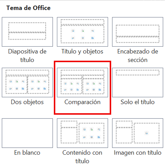 El diseño tipo Comparación posee un título superior y el contenido dividido en dos partes o columnas iguales, que permite desarrollar contenido en cada una de ellas. Este tipo de diapositiva se utiliza para contrastar dos tópicos.