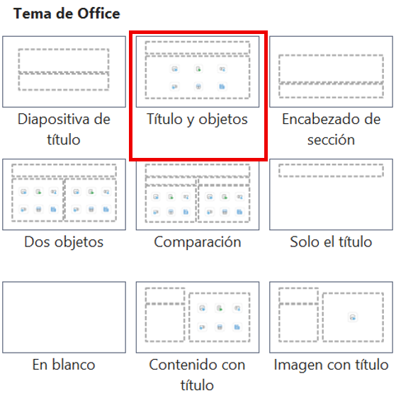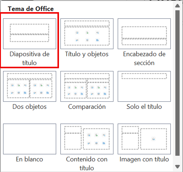 A continuación, se detallan las características de los principales diseños de diapositivas disponibles en las aplicaciones y su función principal.