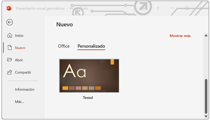 Una vez guardado el tema aparecerá dentro de la sección de temas, en el apartado Personalizado con el nombre que le asignó y podrá utilizarlo para diseñar las presentaciones que desee.