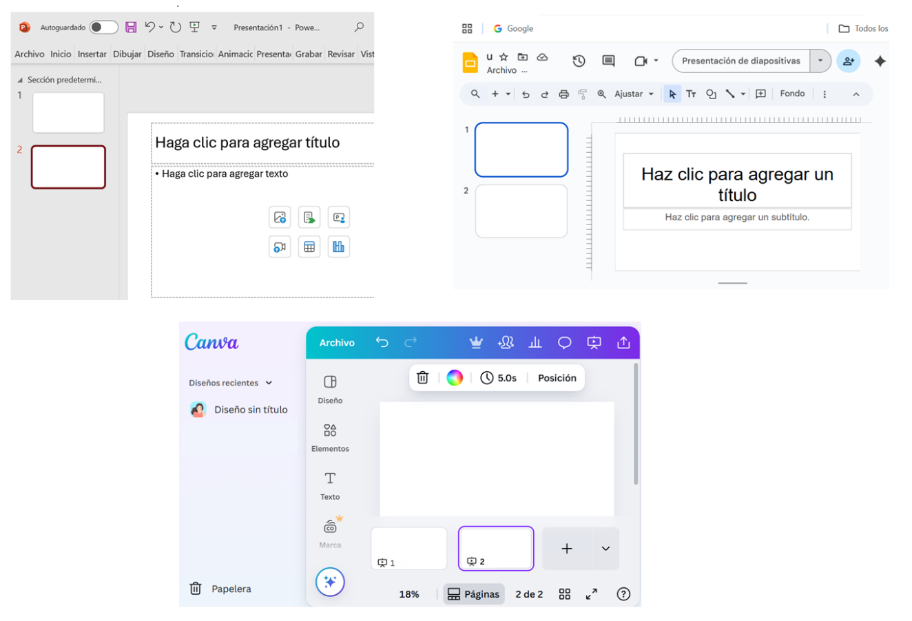 A continuación, se analizan similitudes y diferencias en la interfaz básica de algunas de las aplicaciones para elaboración de presentaciones.