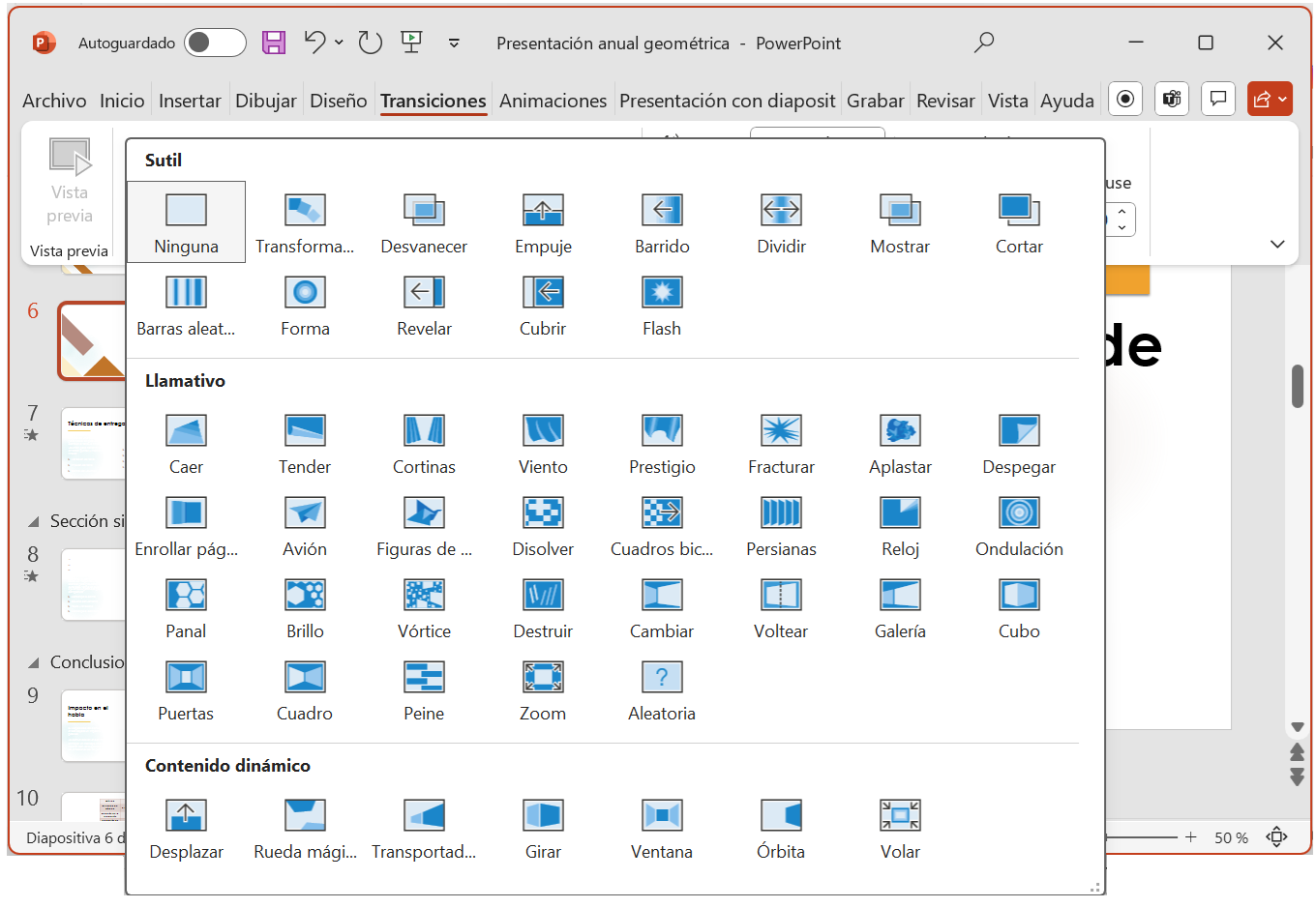 Para organizar estos efectos de paso entre una diapositiva y otra, las transiciones se han organizado en tipos dependiendo de su naturaleza: Sutil, Llamativo y Contenido dinámico.