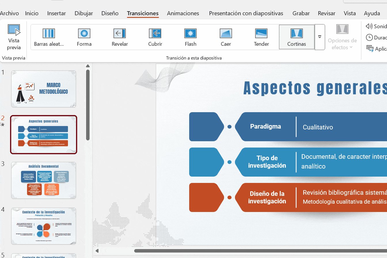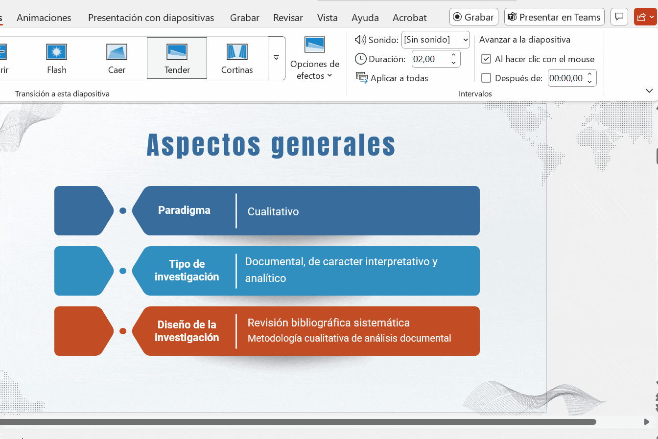 La duración de las transiciones es otro parámetro que es posible personalizar. Cada transición tiene un valor predeterminado en segundos para la duración del pase, pero si la persona desea, puede acelerar o ralentizar modificando la cantidad que se muestra en la opción Duración.