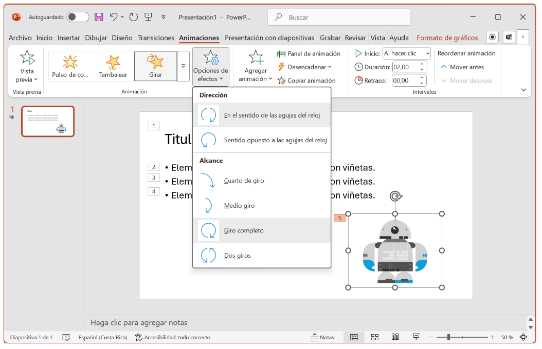 Al aplicar efectos de animación Girar sobre un objeto tipo imagen, como en el último ejemplo que veremos, las opciones cambian según la dirección y el alcance del giro.