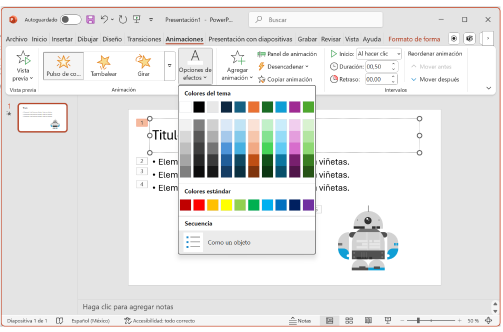 En esta captura de pantalla se observa la selección del texto del título, con animación Pulso de color. Al lado de la cinta de animación se activa un botón de Opciones de animación, dado que es un texto y tiene este tipo de animación, las opciones disponibles son respecto al formato fuente (ver recuadro naranja).