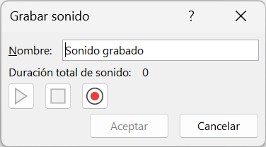 También está disponible la alternativa de Grabar audio la cual activa los controles para realizar una grabación, reproducirla y guardarla dentro de la diapositiva.