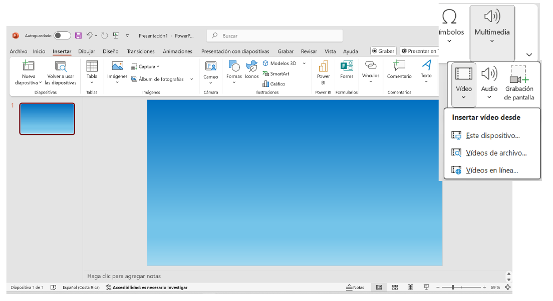 Para insertar un video en una dispositiva el procedimiento es el siguiente: Ir a la opción Insertar del menú principal, al desplegarse, buscar la cinta Multimedia que se encuentra al final a la derecha y hacer clic para mostrar las opciones, hacer clic nuevamente en la opción Video y seleccionar el origen desde el cual se realizará la inserción.