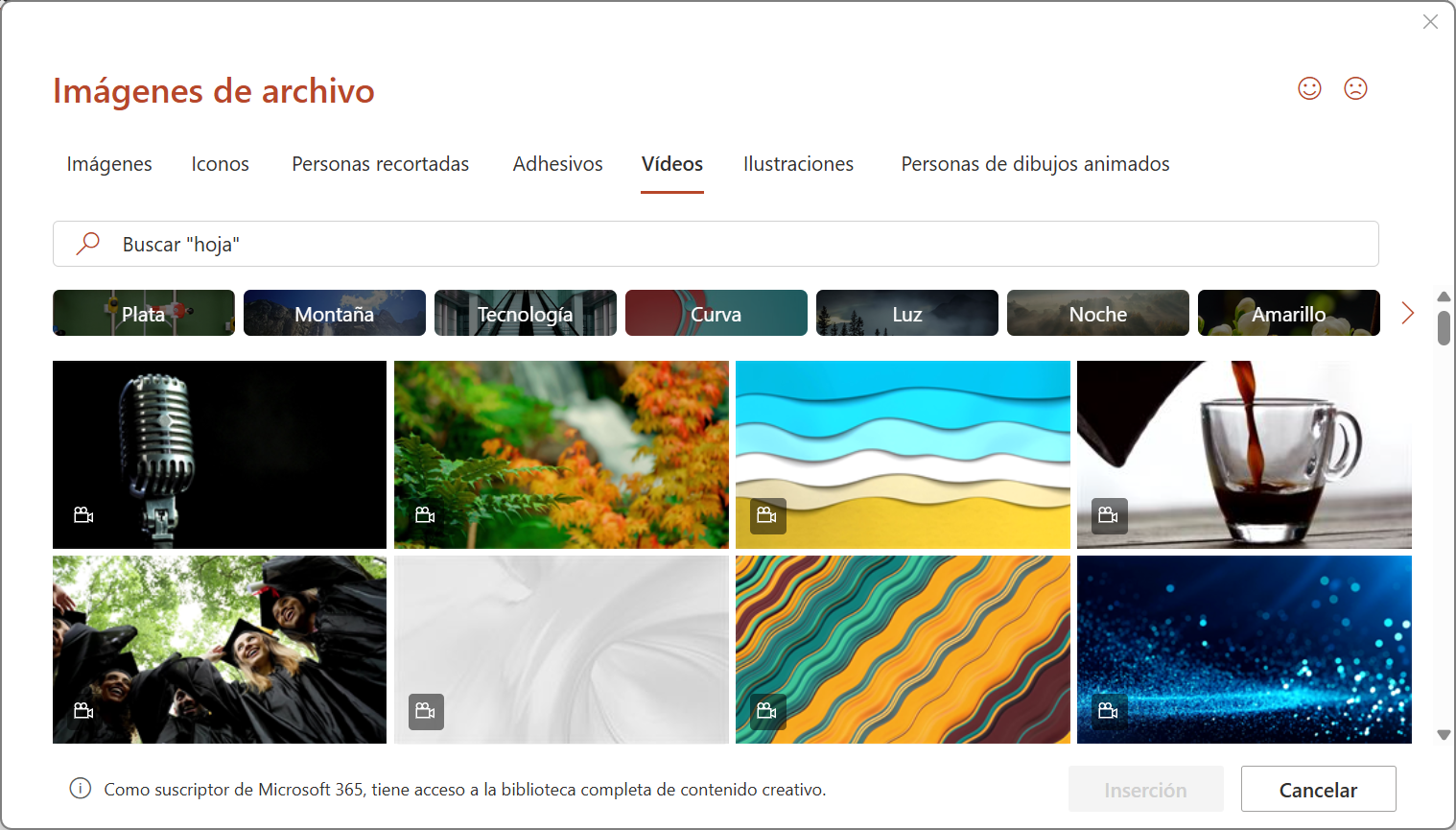 Al seleccionar un elemento se activa el botón Inserción que se encuentra en la esquina inferior derecha; pueden seleccionarse e insertarse varios videos en una sola acción. Todo el contenido de esta biblioteca es contenido creativo de Microsoft 365, el cual permite el uso con fines no comerciales.