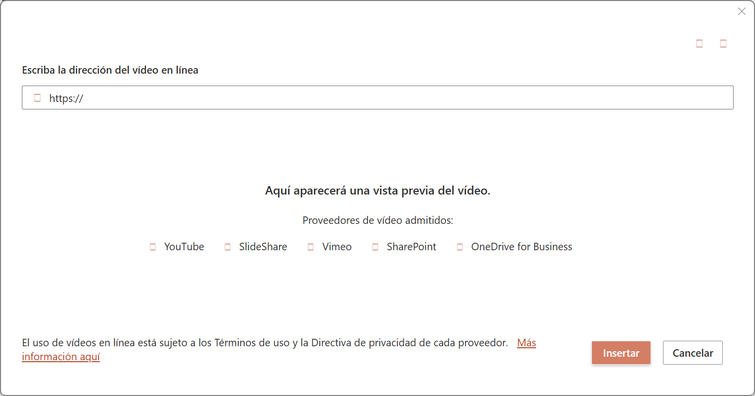 Otra alternativa para insertar un video dentro de una presentación de Power Point es utilizar un video de los que se encuentran disponibles en línea y uno de los principales repositorios de videos es sin duda YouTube. Para hacer uso de un video de YouTube, al seleccionar la opción Videos en línea se abrirá una ventana donde se debe colocar la URL o dirección desde donde deseamos insertar el contenido.