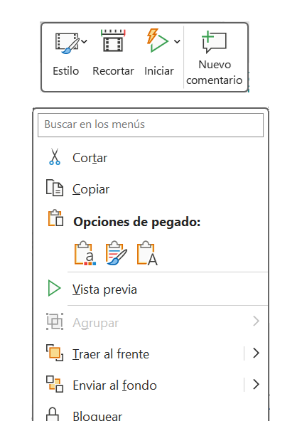 Al desplegar el menú contextual de un video (clic secundario sobre el área de éste) en la parte superior se activa una pequeña barra con botones para modificar el estilo, recortar la duración del video y configurar la forma de reproducción.