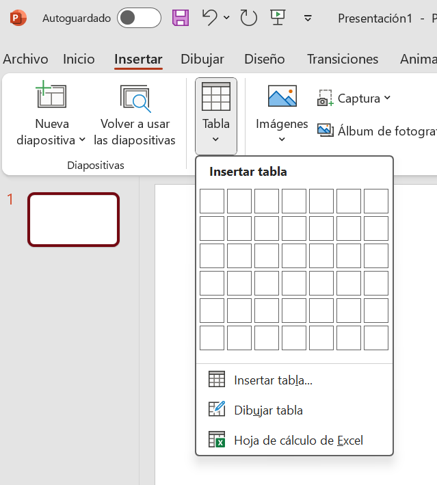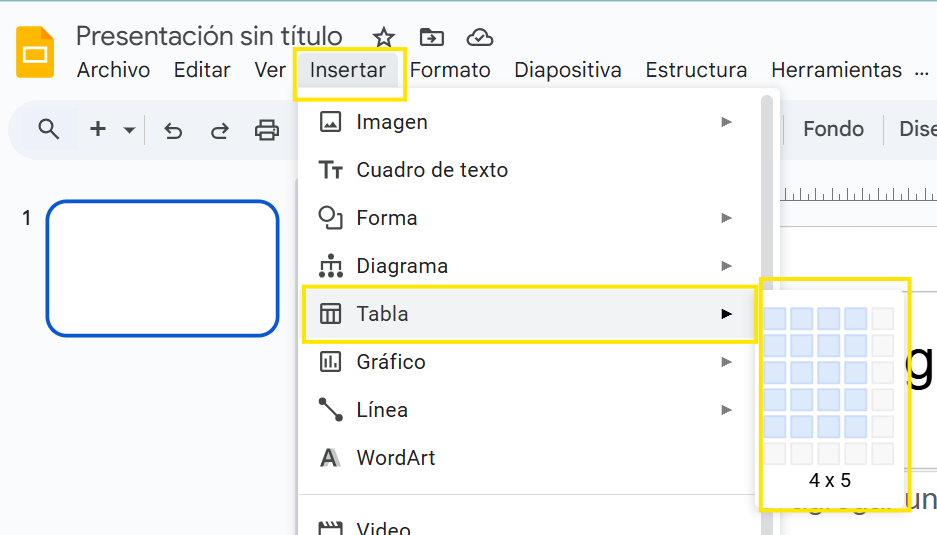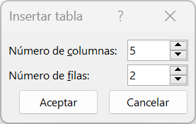 - 1. En el menú superior, seleccione Insertar → Tabla.