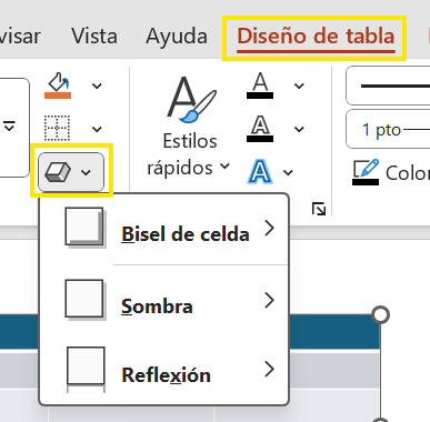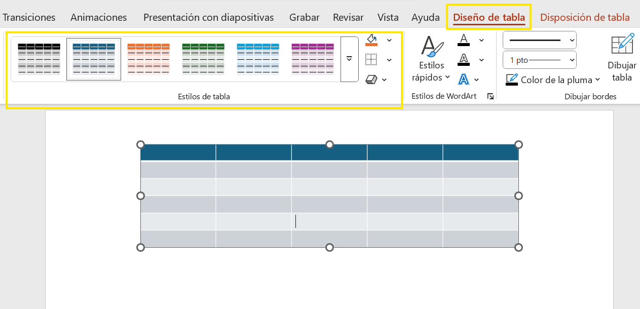En la pestaña Diseño de tabla, PowerPoint ofrece una galería de estilos con combinaciones de colores, bordes y sombreados.