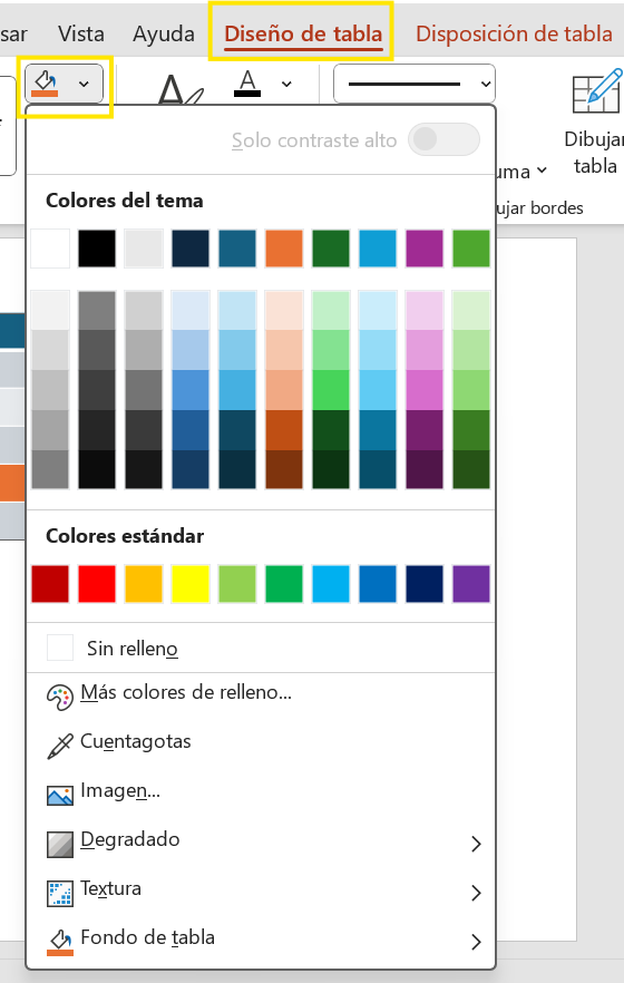 En la pestaña Diseño, haga clic en Sombreado para cambiar el color de fondo de una o varias celdas.