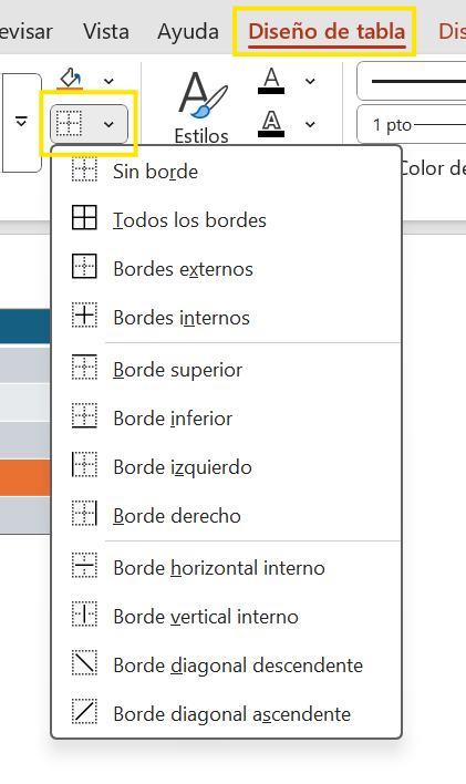 Seleccione Bordes → Todos los bordes, exteriores, interiores y ajuste el grosor para diferenciar encabezados o secciones importantes.