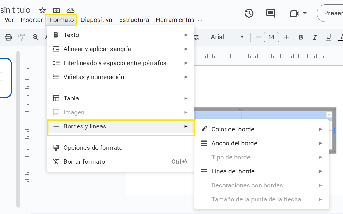 Seleccione la tabla → Formato → Bordes y líneas para elegir color, grosor y estilo de líneas.