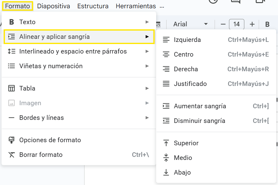 - Para alinear el contenido: Formato → Alinear → Izquierda, centro o derecha..