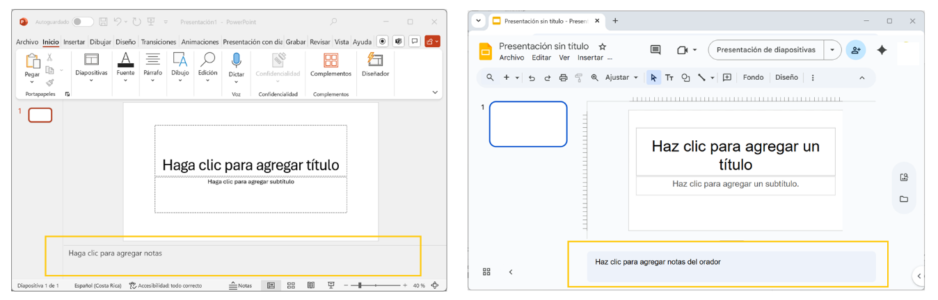 En PowerPoint y Slides de Google las notas del orador se agregan de forma sencilla haciendo clic sobre el espacio destinado para ello en el modo de vista edición normal.