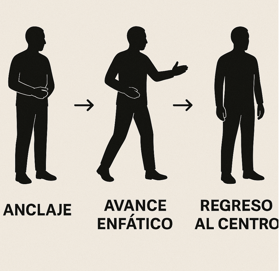 - Permanezca anclado al presentar ideas clave; muévase (2–3 pasos) para transiciones o cambio de tema. El movimiento debe tener propósito.