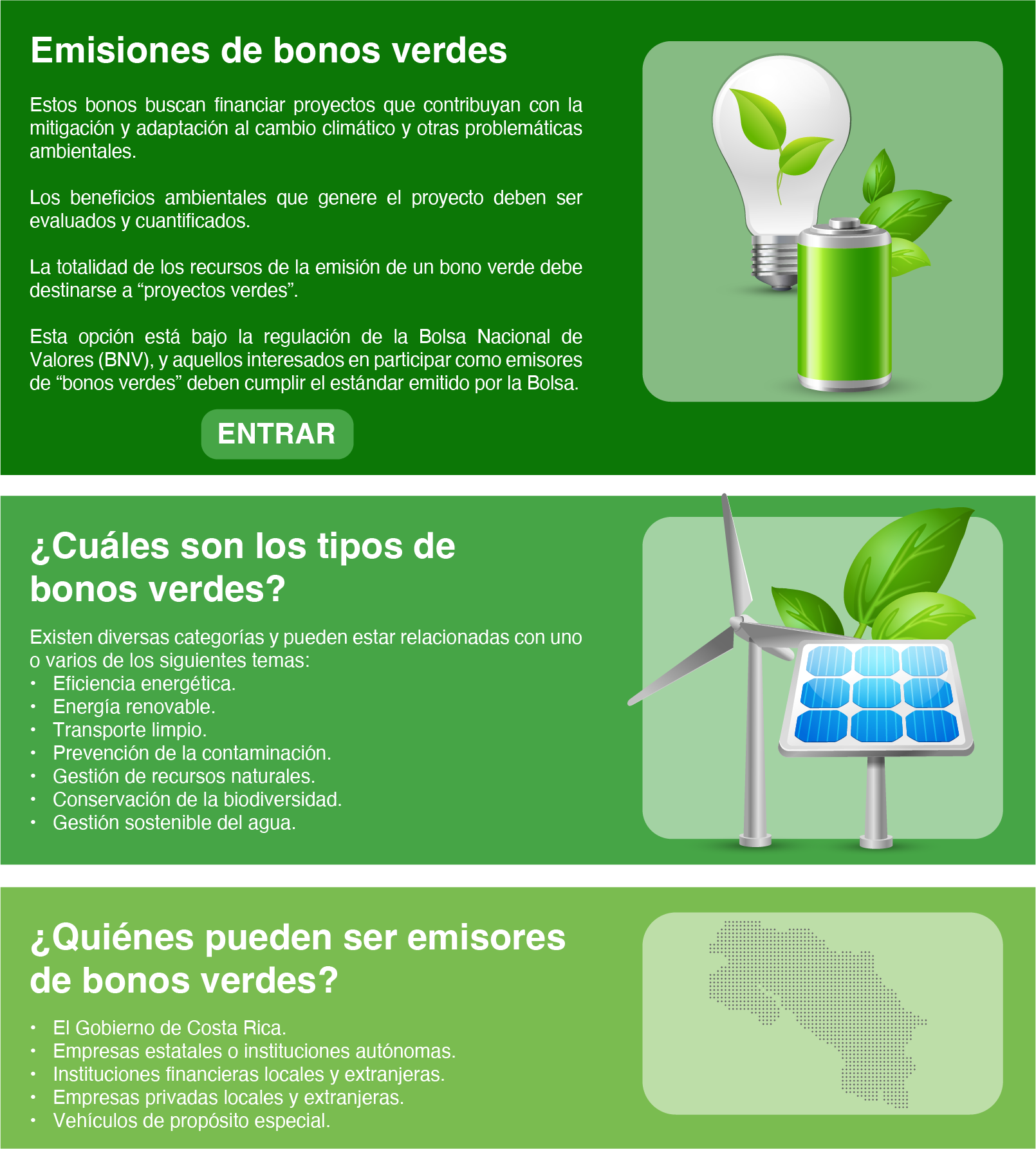 * Esta opción está bajo la regulación de la Bolsa Nacional de Valores y aquellos interesados en participar como emisores de “bonos verdes” deben cumplir el estándar emitido por la Bolsa. Entrar